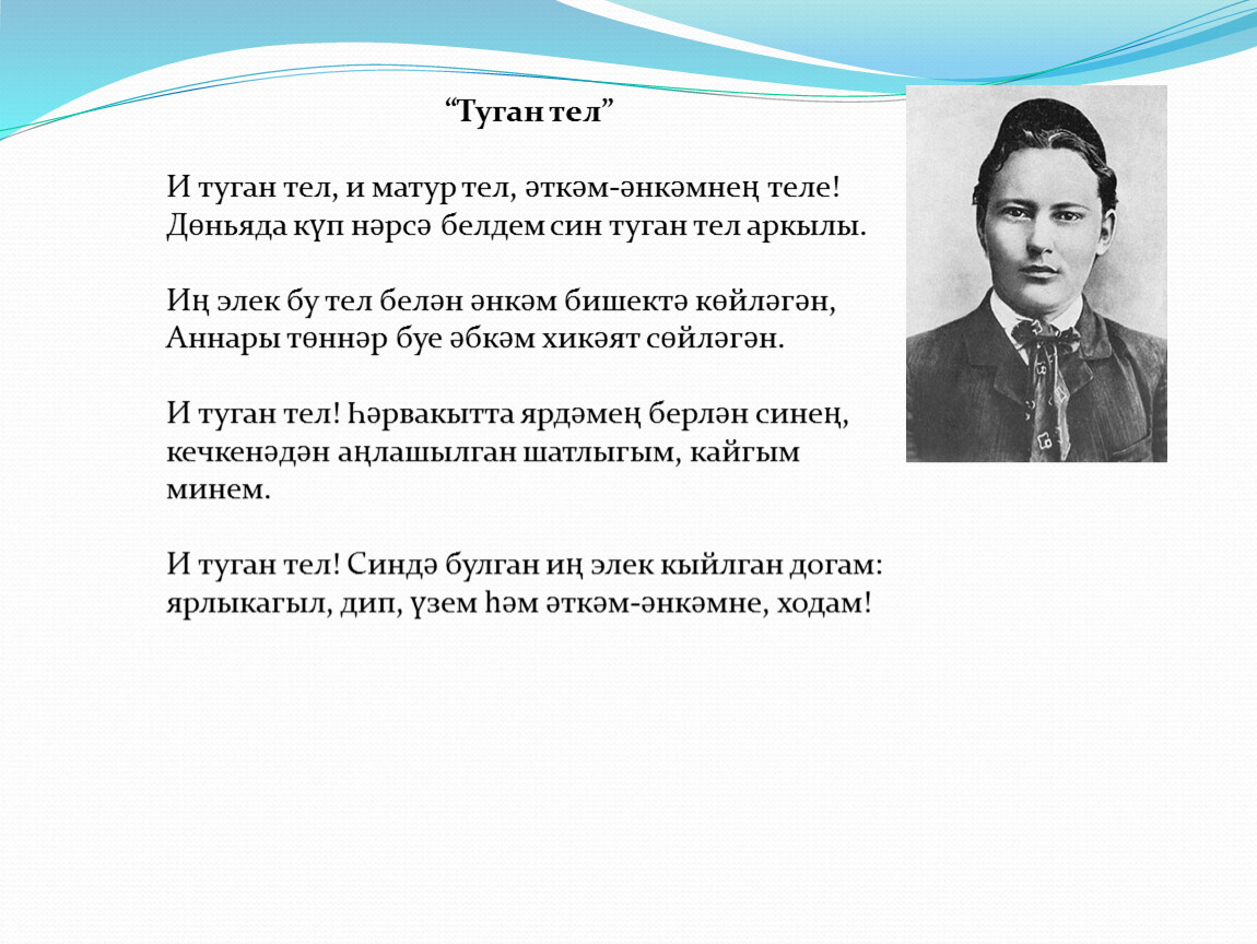 Бу дөньяда, бәлки, күп-күп эшләр күрем, Билгесездер — кая ташлар бу тәкъдирем; Кая барсам, кайда торсам, нишләсәм дә, Хәтеремдә мәңге калыр туган җирем.
