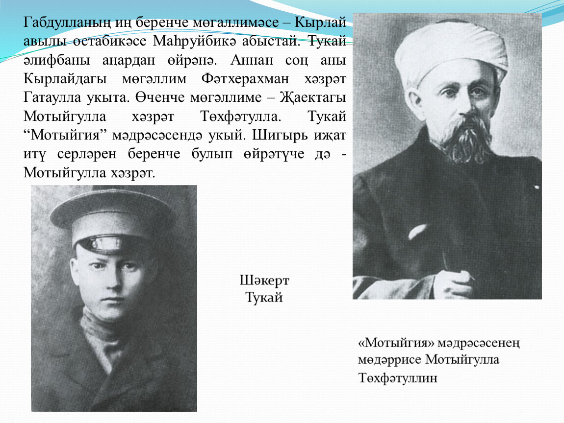 Габдулланың иң беренче мөгаллимәсе – Кырлай авылы остабикәсе Маһруйбикә абыстай. Тукай әлифбаны аңардан өйрәнә. Аннан соң аны Кырлайдагы мөгәллим Фәтхерахман хәзрәт Гатаулла укыта. Өченче мөгәллиме – Җаектагы Мотыйгулла хәзрәт Төхфәтулла. Тукай “Мотыйгия” мәдрәсәсендә укый. Шигырь иҗат итү серләрен беренче булып өйрәтүче дә - Мотыйгулла хәзрәт.