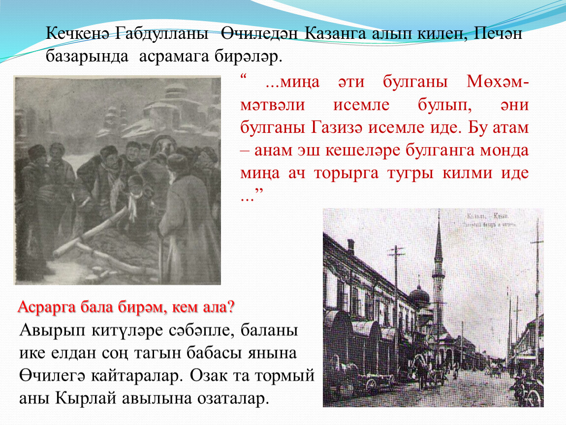 Кечкенә Габдулланы Өчиледән Казанга алып килеп, Печән базарында асрамага бирәләр.