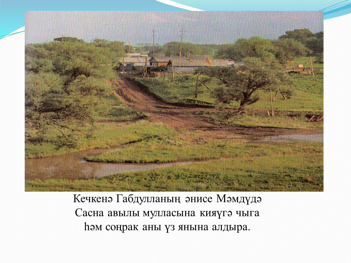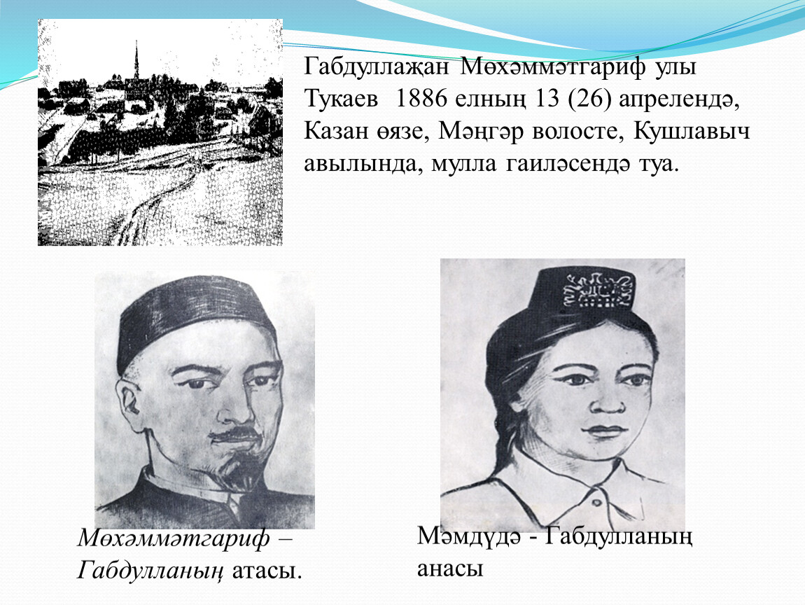 “ ...миңа әти булганы Мөхәм-мәтвәли исемле булып, әни булганы Газизә исемле иде. Бу атам – анам эш кешеләре булганга монда миңа ач торырга тугры килми иде ...”