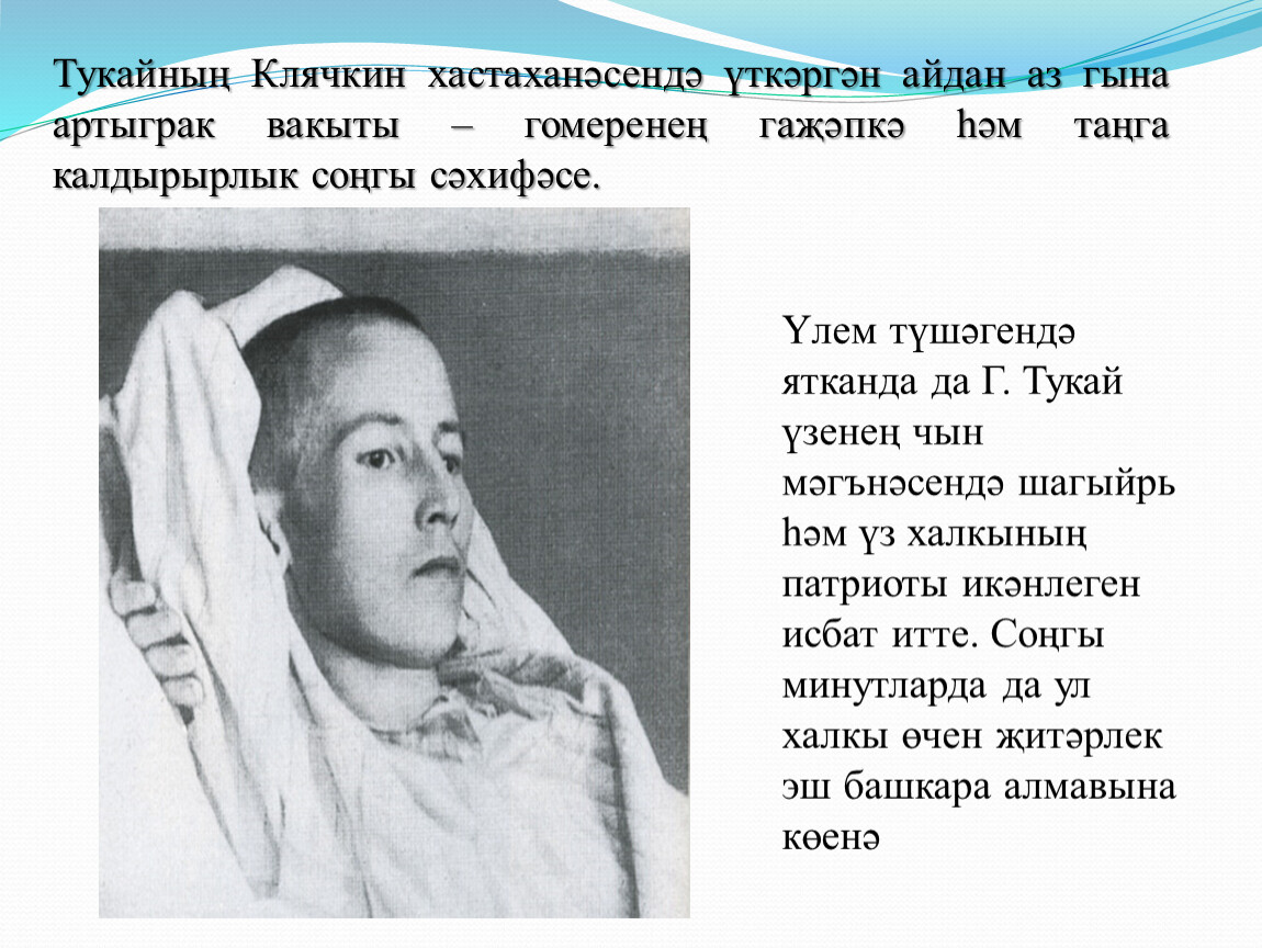 Тукайның Клячкин хастаханәсендә үткәргән айдан аз гына артыграк вакыты – гомеренең гаҗәпкә һәм таңга калдырырлык соңгы сәхифәсе.