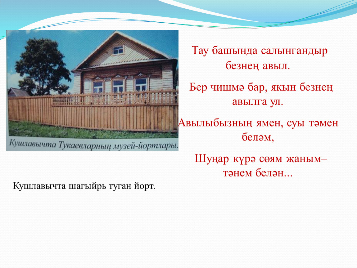 Тау башына салынгандыр безнең авыл, Бер чишмә бар, якын безнең авылга ул; Аулыбызның ямен, суы тәмен беләм, Шуңар күрә сөям җаным-тәнем белән.