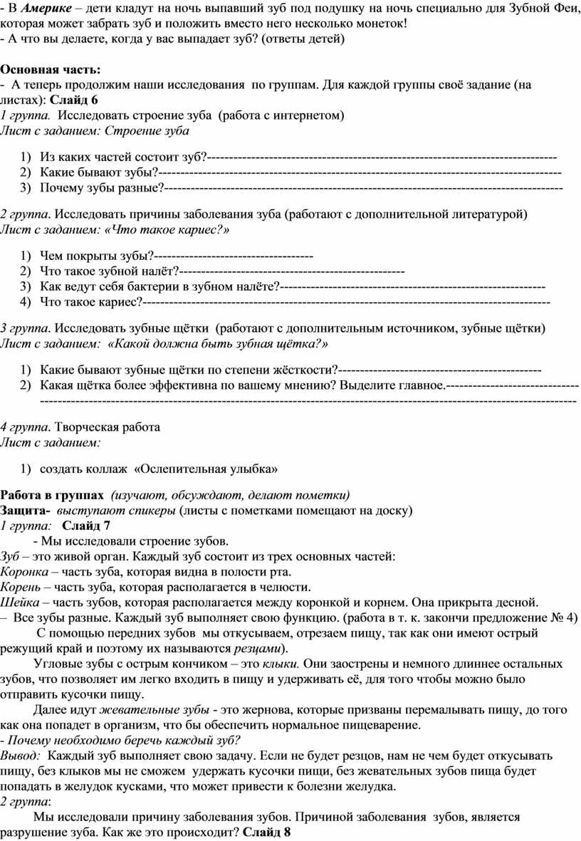 Оборудование: компьютер, песня: «От улыбки», флипчарт, для каждого учащегося технологическая карта «Я узнал…», ручка, зеркальце, дольки яблока, красный, жёлтый карандаш, листы с заданием на каждую группу, 1 группа- интернет, 2 группа – справочник, 3 группа – зубные щётки и дополнительный источник информации, 4 группа- ½ ватмана, с надписью «Ослепительная улыбка», картинки с изображением улыбающихся людей, ножницы, клей, салфетки, клеёнки, макет зубной челюсти человека, зубная щётка, шапочка для стоматолога, конверт сердечками – памятками.