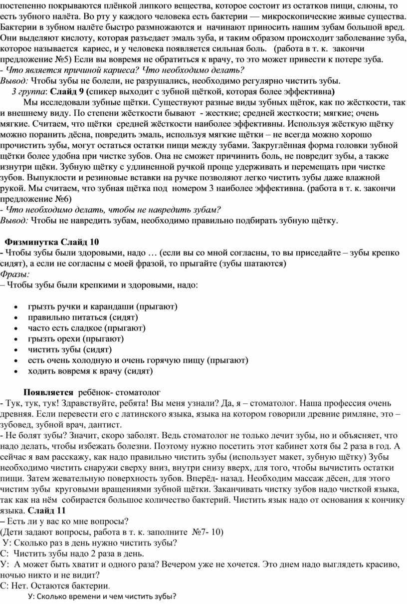 - Не болят зубы? Значит, скоро заболят. Ведь стоматолог не только лечит зубы, но и объясняет, что надо делать, чтобы избежать болезни. Поэтому нужно посетить этот кабинет хотя бы 2 раза в год. А сейчас я вам расскажу, как надо правильно чистить зубы (использует макет, зубную щётку) Зубы необходимо чистить снаружи сверху вниз, внутри снизу вверх, для того, чтобы вычистить остатки пищи. Затем жевательную поверхность зубов. Вперёд- назад. Необходим массаж дёсен, для этого чистим зубы круговыми вращениями зубной щётки. Заканчивать чистку зубов надо чисткой языка, так как на нём собирается большое количество бактерий. Чистить язык надо от основания к кончику языка. Слайд 11