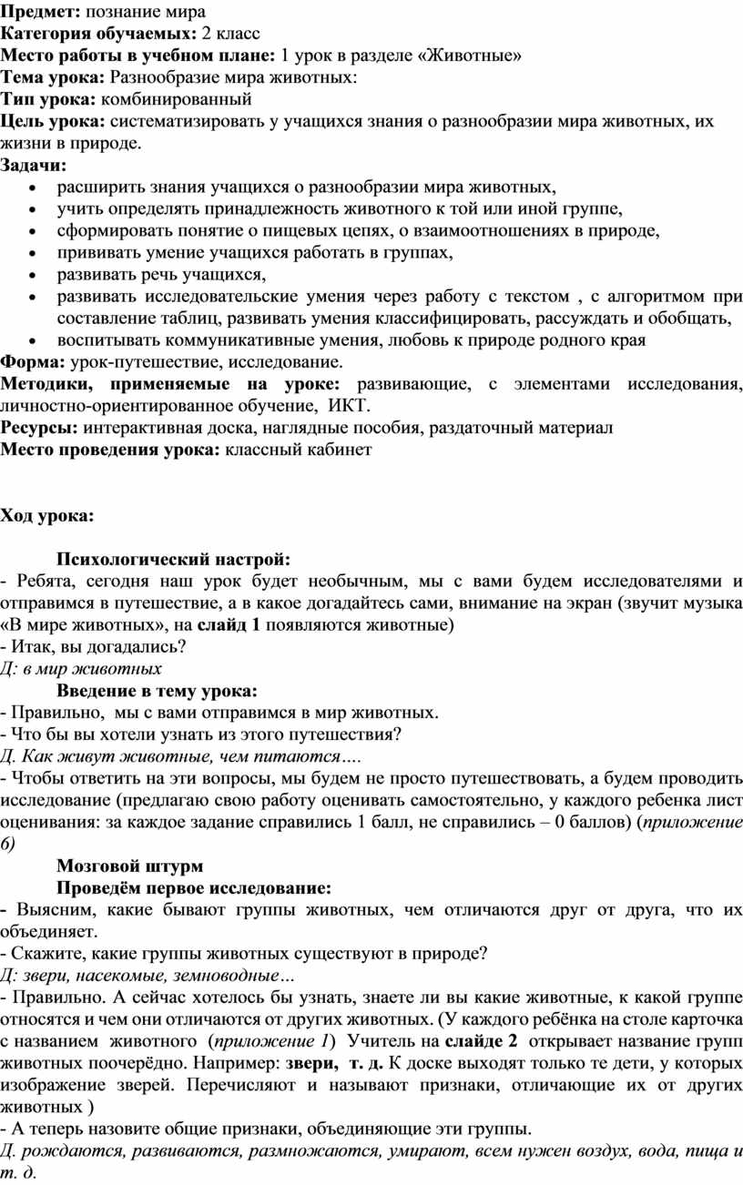 Место работы в учебном плане: 1 урок в разделе «Животные»