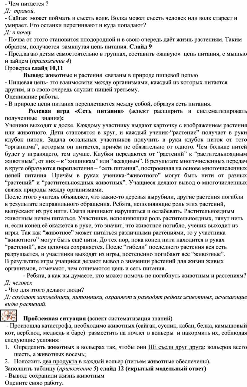 Ученики выходят к доске. Каждому участнику выдают карточку с изображением растения или животного. Дети становятся в круг, и каждый ученик-“растение” получает в руки клубок ниток. Задача остальных участников получить в руки клубок ниток от того “организма”, которым он питается, причём не обязательно от одного. Чем больше нитей будет у играющего, тем лучше. Клубки передаются от “растений” к “растительноядным животным”, от них – к “хищникам” или “всеядным”. В результате многочисленных передач в круге образуются переплетения – “сеть питания”, построенная на основе многочисленных цепей питания. Причём в руках ученика-“животного” могут быть нити от разных “растений” и “растительноядных животных”. Учащиеся делают вывод о многочисленных связях природы между организмами.
