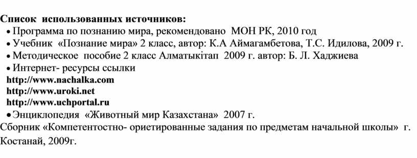 · Учебник «Познание мира» 2 класс, автор: К.А Аймагамбетова, Т.С. Идилова, 2009 г.