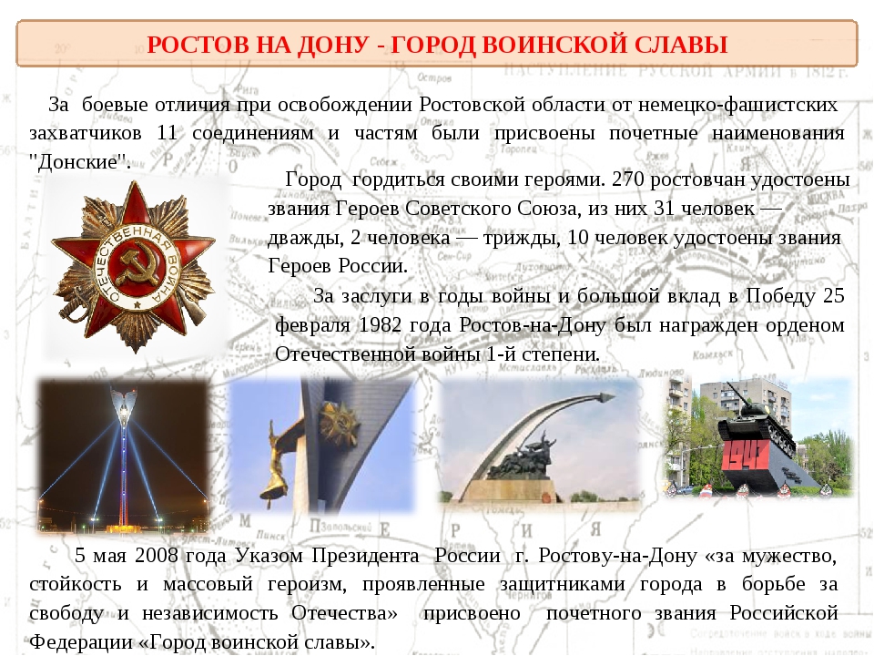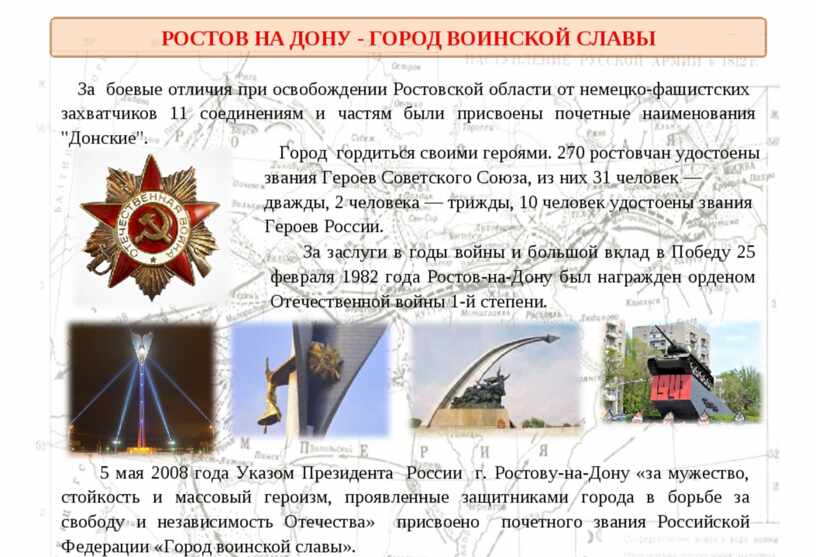 Указом Президента РФ от 5 мая 2008 г. за мужество, стойкость и героизм, проявленные защитниками города в борьбе за свободу и независимость Отечества, Ростову-на-Дону присвоено почетное звание Российской Федерации «Город воинской славы».