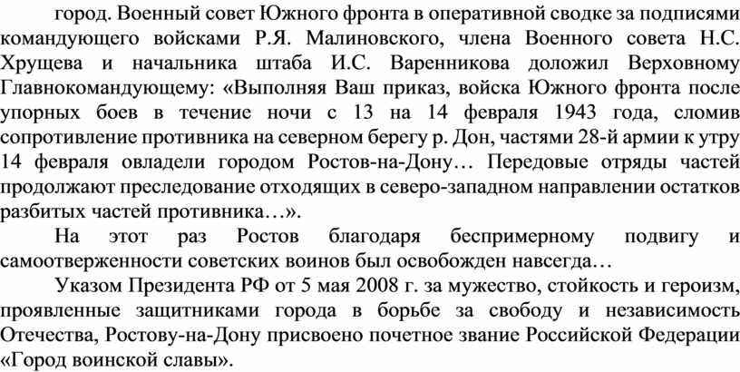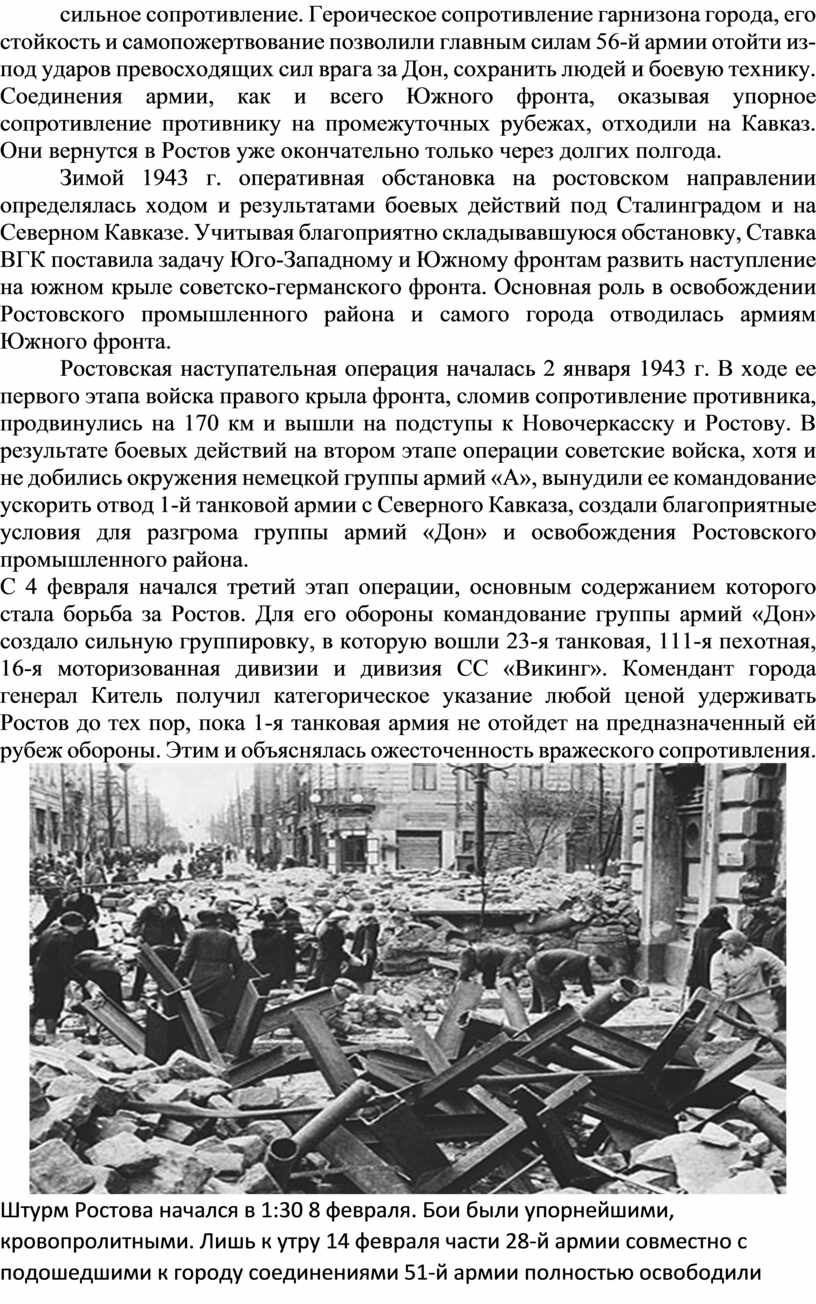 Штурм Ростова начался в 1:30 8 февраля. Бои были упорнейшими, кровопролитными. Лишь к утру 14 февраля части 28-й армии совместно с подошедшими к городу соединениями 51-й армии полностью освободили город. Военный совет Южного фронта в оперативной сводке за подписями командующего войсками Р.Я. Малиновского, члена Военного совета Н.С. Хрущева и начальника штаба И.С. Варенникова доложил Верховному Главнокомандующему: «Выполняя Ваш приказ, войска Южного фронта после упорных боев в течение ночи с 13 на 14 февраля 1943 года, сломив сопротивление противника на северном берегу р. Дон, частями 28-й армии к утру 14 февраля овладели городом Ростов-на-Дону… Передовые отряды частей продолжают преследование отходящих в северо-западном направлении остатков разбитых частей противника…».