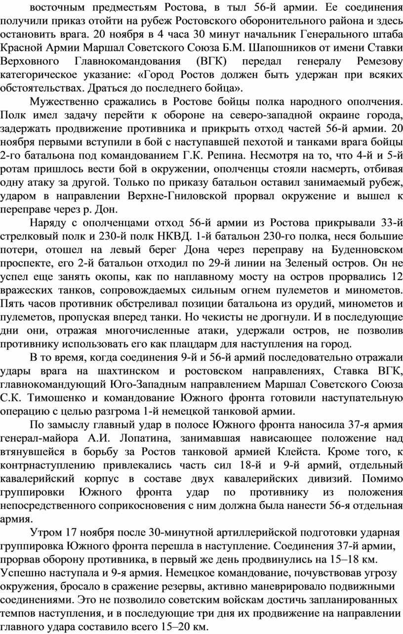 Мужественно сражались в Ростове бойцы полка народного ополчения. Полк имел задачу перейти к обороне на северо-западной окраине города, задержать продвижение противника и прикрыть отход частей 56-й армии. 20 ноября первыми вступили в бой с наступавшей пехотой и танками врага бойцы 2-го батальона под командованием Г.К. Репина. Несмотря на то, что 4-й и 5-й ротам пришлось вести бой в окружении, ополченцы стояли насмерть, отбивая одну атаку за другой. Только по приказу батальон оставил занимаемый рубеж, ударом в направлении Верхне-Гниловской прорвал окружение и вышел к переправе через р. Дон.