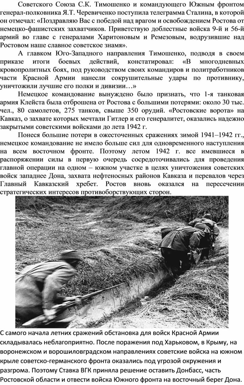 Понеся большие потери в ожесточенных сражениях зимой 1941–1942 гг., немецкое командование не имело больше сил для одновременного наступления на всем восточном фронте. Поэтому летом 1942 г. все имевшиеся в распоряжении силы в первую очередь сосредоточивались для проведения главной операции на одном – южном участке в целях уничтожения советских войск западнее Дона, захвата нефтеносных районов Кавказа и перевалов через Главный Кавказский хребет. Ростов вновь оказался на пересечении стратегических интересов противоборствующих сторон.