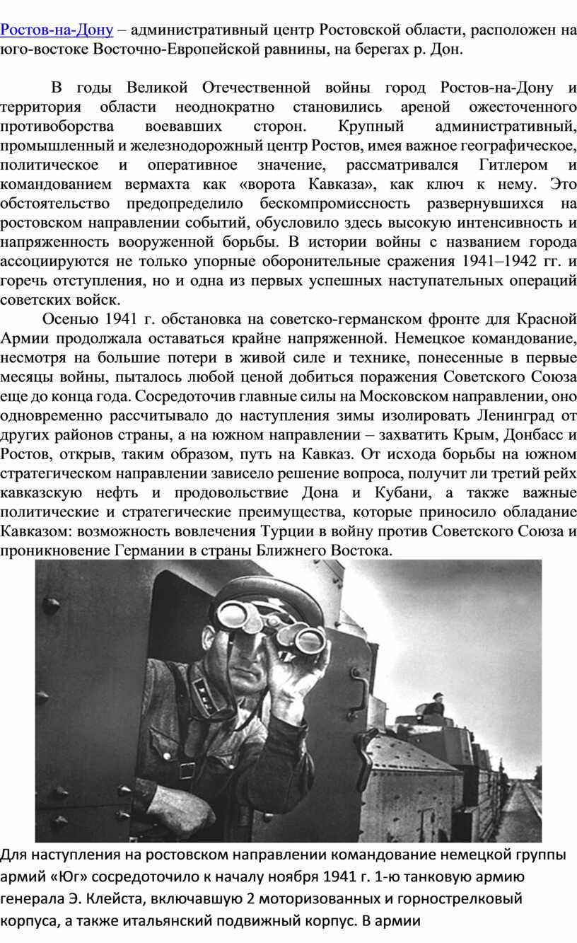 В годы Великой Отечественной войны город Ростов-на-Дону и территория области неоднократно становились ареной ожесточенного противоборства воевавших сторон. Крупный административный, промышленный и железнодорожный центр Ростов, имея важное географическое, политическое и оперативное значение, рассматривался Гитлером и командованием вермахта как «ворота Кавказа», как ключ к нему. Это обстоятельство предопределило бескомпромиссность развернувшихся на ростовском направлении событий, обусловило здесь высокую интенсивность и напряженность вооруженной борьбы. В истории войны с названием города ассоциируются не только упорные оборонительные сражения 1941–1942 гг. и горечь отступления, но и одна из первых успешных наступательных операций советских войск.