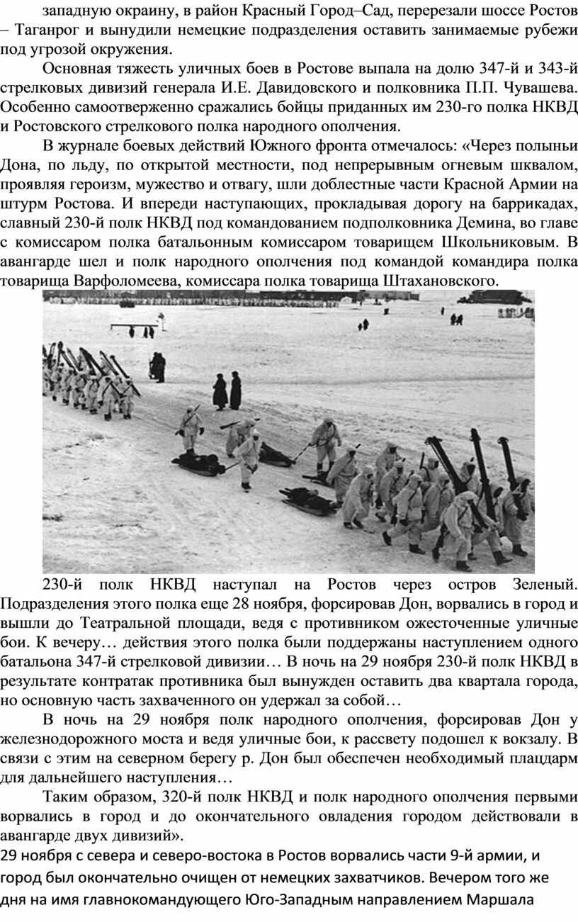230-й полк НКВД наступал на Ростов через остров Зеленый. Подразделения этого полка еще 28 ноября, форсировав Дон, ворвались в город и вышли до Театральной площади, ведя с противником ожесточенные уличные бои. К вечеру… действия этого полка были поддержаны наступлением одного батальона 347-й стрелковой дивизии… В ночь на 29 ноября 230-й полк НКВД в результате контратак противника был вынужден оставить два квартала города, но основную часть захваченного он удержал за собой…