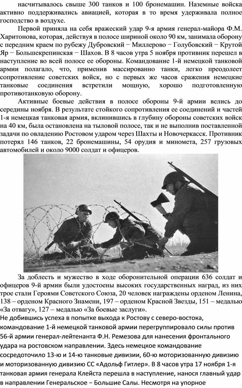 Ростовская наступательная операция началась 2 января 1943 г. В ходе ее первого этапа войска правого крыла фронта, сломив сопротивление противника, продвинулись на 170 км и вышли на подступы к Новочеркасску и Ростову. В результате боевых действий на втором этапе операции советские войска, хотя и не добились окружения немецкой группы армий «А», вынудили ее командование ускорить отвод 1-й танковой армии с Северного Кавказа, создали благоприятные условия для разгрома группы армий «Дон» и освобождения Ростовского промышленного района.