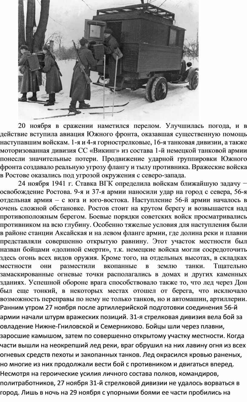 24 ноября 1941 г. Ставка ВГК определила войскам ближайшую задачу − освобождение Ростова. 9-я и 37-я армии наносили удар на город с севера, 56-я отдельная армия – с юга и юго-востока. Наступление 56-й армии началось в очень сложной обстановке. Ростов стоит на крутом берегу и возвышается над противоположным берегом. Боевые порядки советских войск просматривались противником на всю глубину. Особенно тяжелые условия для наступления были в районе станции Аксайская и на левом фланге армии, где долина реки и плавни представляли совершенно открытую равнину. Этот участок местности был назван бойцами «долиной смерти», т.к. немецкие войска могли сосредоточить здесь огонь всех видов оружия. Кроме того, на отдельных высотах, в складках местности они разместили вкопанные в землю танки. Тщательно замаскированные огневые точки располагались в домах и других каменных зданиях. Успешной обороне врага способствовало также то, что лед через Дон был еще тонкий, в некоторых местах отошел от берега, что исключало возможность переправы по нему не только танков, но и автомашин, артиллерии.