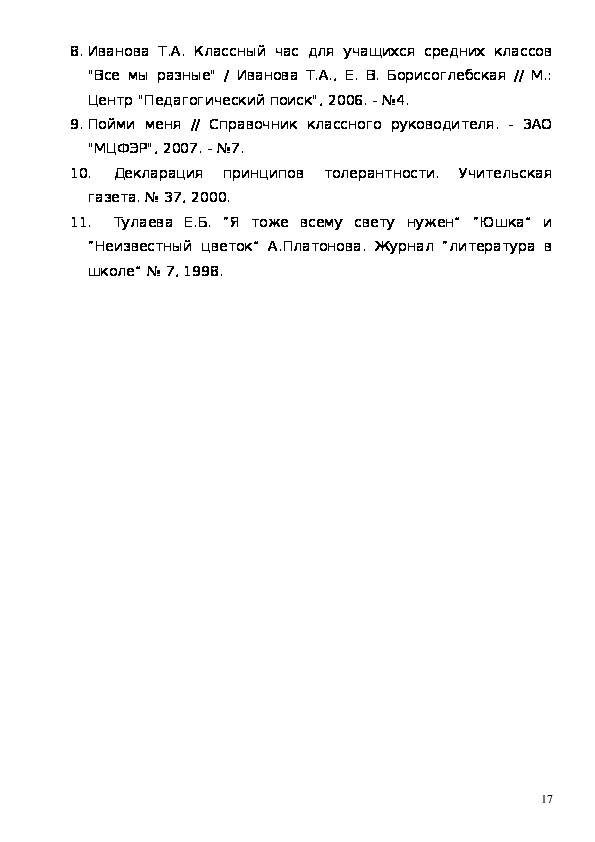 3. Булгакова М.Н. Воспитание толерантности / М. Н. Булгакова // Справочник