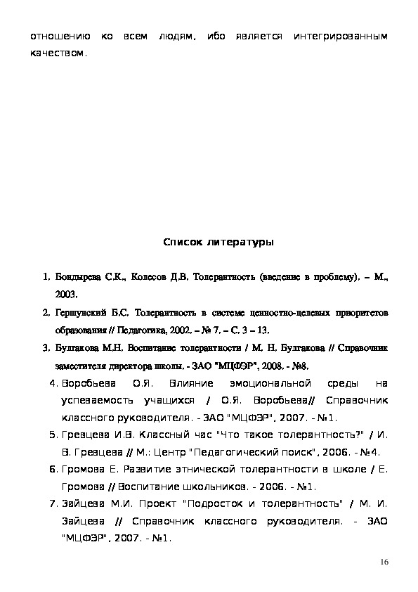 1. Бондырева С.К., Колесов Д.В. Толерантность (введение в проблему). – М.,