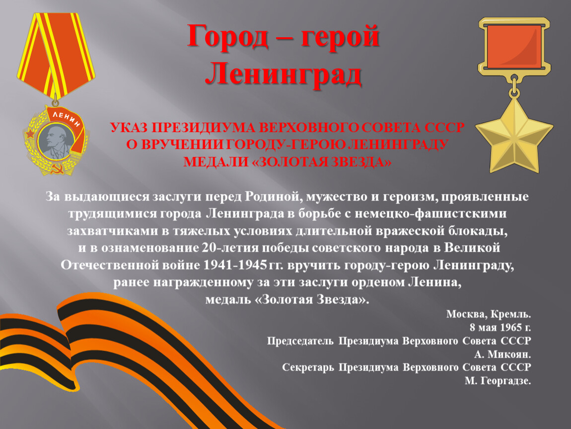 УКАЗ ПРЕЗИДИУМА ВЕРХОВНОГО СОВЕТА СССРО ВРУЧЕНИИ ГОРОДУ-ГЕРОЮ ЛЕНИНГРАДУ