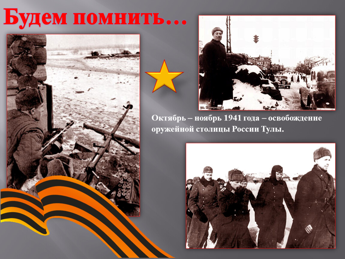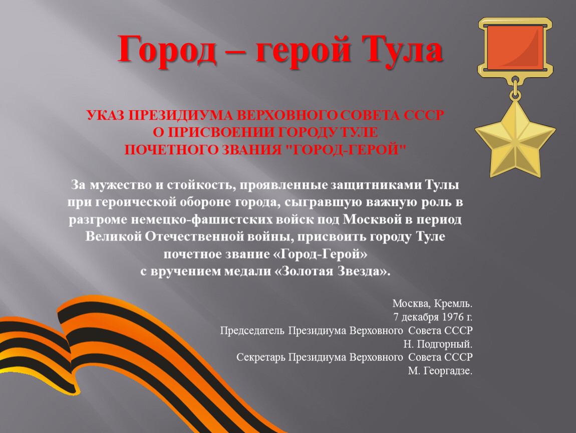 За мужество и стойкость, проявленные защитниками Тулы при героической обороне города, сыгравшую важную роль в разгроме немецко-фашистских войск под Москвой в период Великой Отечественной войны, присвоить городу Туле почетное звание «Город-Герой»
