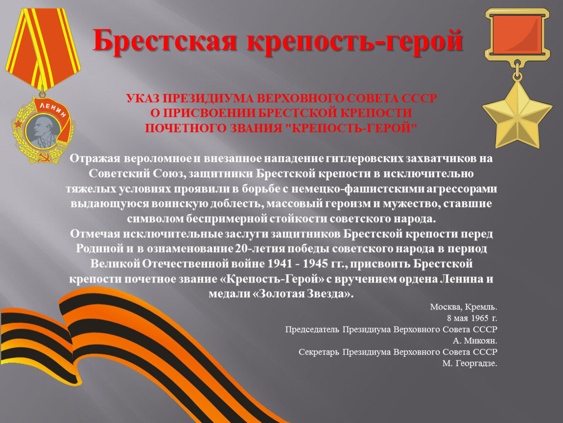 Отмечая исключительные заслуги защитников Брестской крепости перед Родиной и в ознаменование 20-летия победы советского народа в период Великой Отечественной войне 1941 - 1945 гг., присвоить Брестской крепости почетное звание «Крепость-Герой» с вручением ордена Ленина и медали «Золотая Звезда».