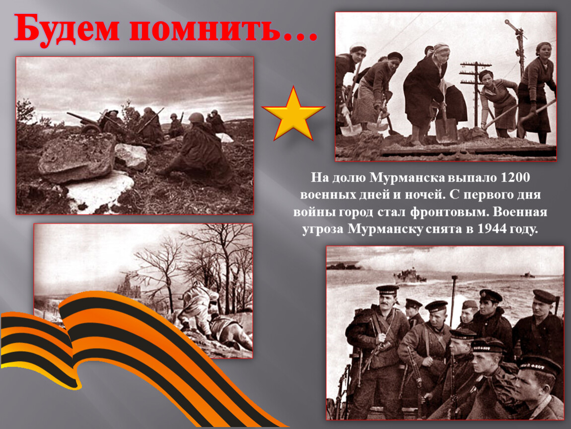 На долю Мурманска выпало 1200 военных дней и ночей. С первого дня войны город стал фронтовым. Военная угроза Мурманску снята в 1944 году.