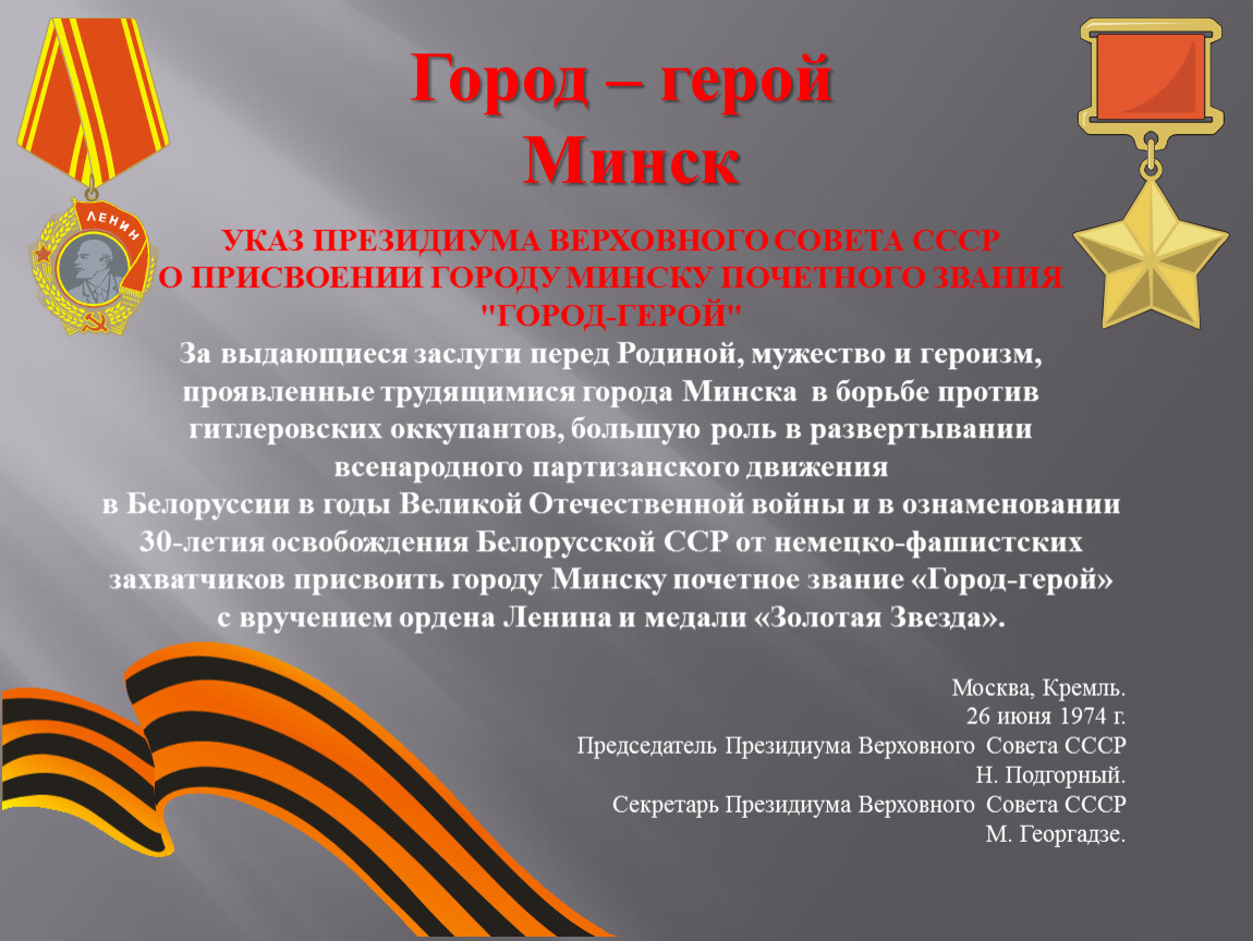 УКАЗ ПРЕЗИДИУМА ВЕРХОВНОГО СОВЕТА СССРО ПРИСВОЕНИИ ГОРОДУ МИНСКУ ПОЧЕТНОГО ЗВАНИЯ