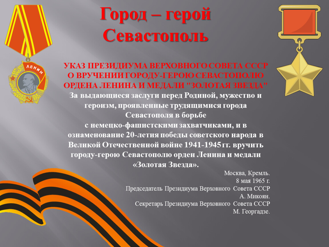 с немецко-фашистскими захватчиками, и в ознаменование 20-летия победы советского народа в Великой Отечественной войне 1941-1945 гг. вручить городу-герою Севастополю орден Ленина и медали «Золотая Звезда».