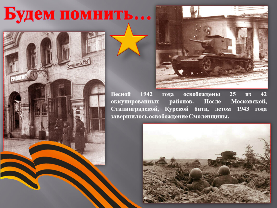 Весной 1942 года освобождены 25 из 42 оккупированных районов. После Московской, Сталинградской, Курской битв, летом 1943 года завершилось освобождение Смоленщины.