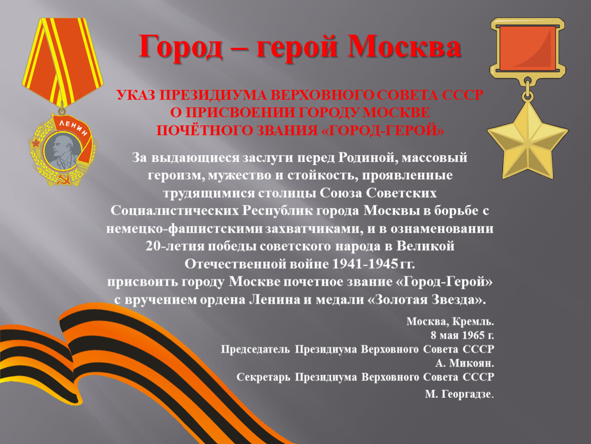 За выдающиеся заслуги перед Родиной, массовый героизм, мужество и стойкость, проявленные трудящимися столицы Союза Советских Социалистических Республик города Москвы в борьбе с немецко-фашистскими захватчиками, и в ознаменовании 20-летия победы советского народа в Великой Отечественной войне 1941-1945 гг. присвоить городу Москве почетное звание «Город-Герой» с вручением ордена Ленина и медали «Золотая Звезда».