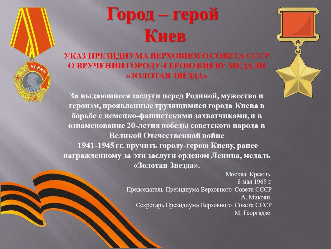 1941-1945 гг. вручить городу-герою Киеву, ранее награжденному за эти заслуги орденом Ленина, медаль «Золотая Звезда».