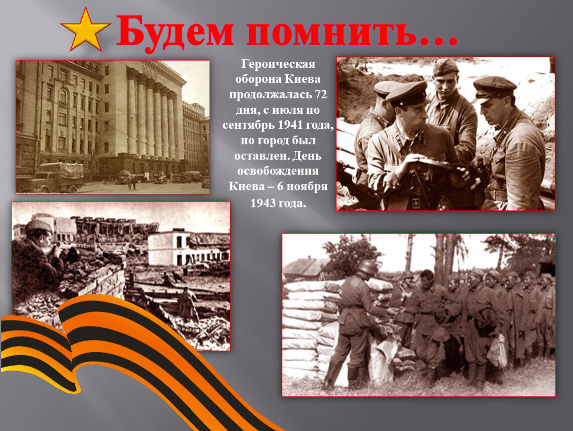 Героическая оборона Киева продолжалась 72 дня, с июля по сентябрь 1941 года, но город был оставлен. День освобождения Киева – 6 ноября 1943 года.