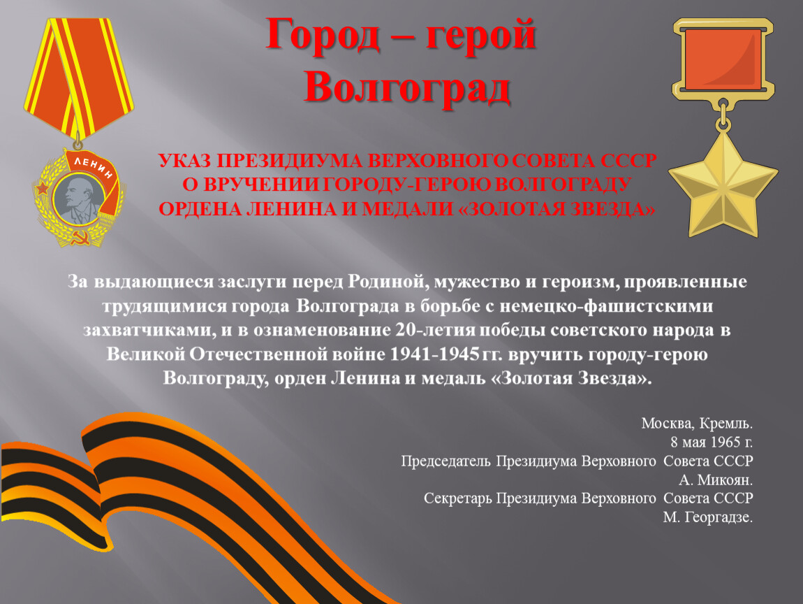 УКАЗ ПРЕЗИДИУМА ВЕРХОВНОГО СОВЕТА СССРО ВРУЧЕНИИ ГОРОДУ-ГЕРОЮ ВОЛГОГРАДУ