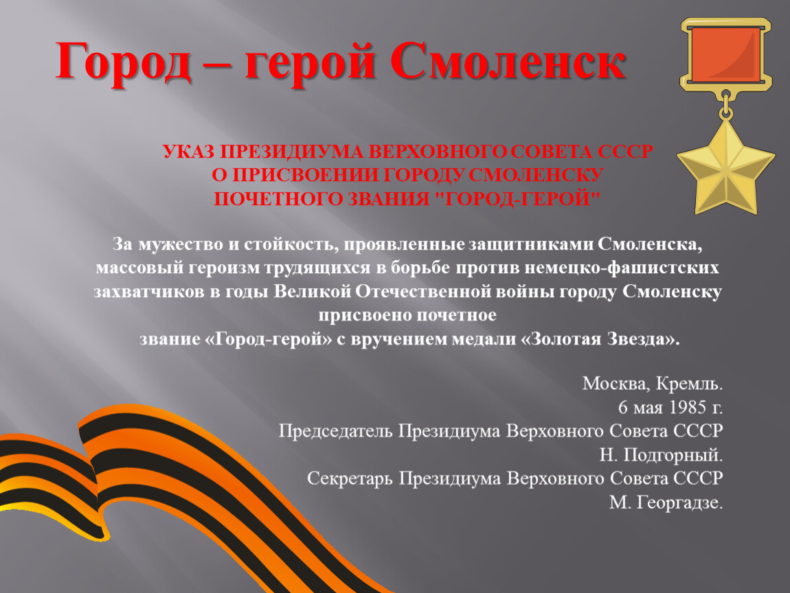 УКАЗ ПРЕЗИДИУМА ВЕРХОВНОГО СОВЕТА СССРО ПРИСВОЕНИИ ГОРОДУ СМОЛЕНСКУ