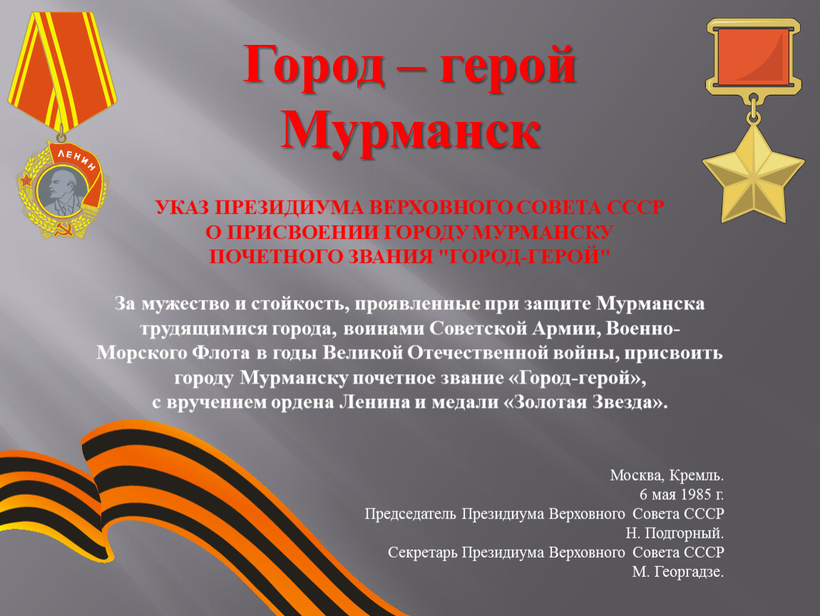 За мужество и стойкость, проявленные при защите Мурманска трудящимися города, воинами Советской Армии, Военно-Морского Флота в годы Великой Отечественной войны, присвоить городу Мурманску почетное звание «Город-герой»,