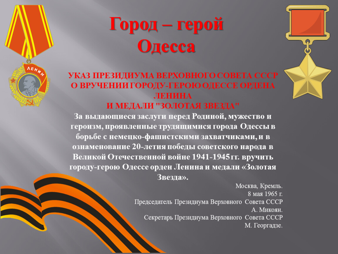 За выдающиеся заслуги перед Родиной, мужество и героизм, проявленные трудящимися города Одессы в борьбе с немецко-фашистскими захватчиками, и в ознаменование 20-летия победы советского народа в Великой Отечественной войне 1941-1945 гг. вручить городу-герою Одессе орден Ленина и медали «Золотая Звезда».
