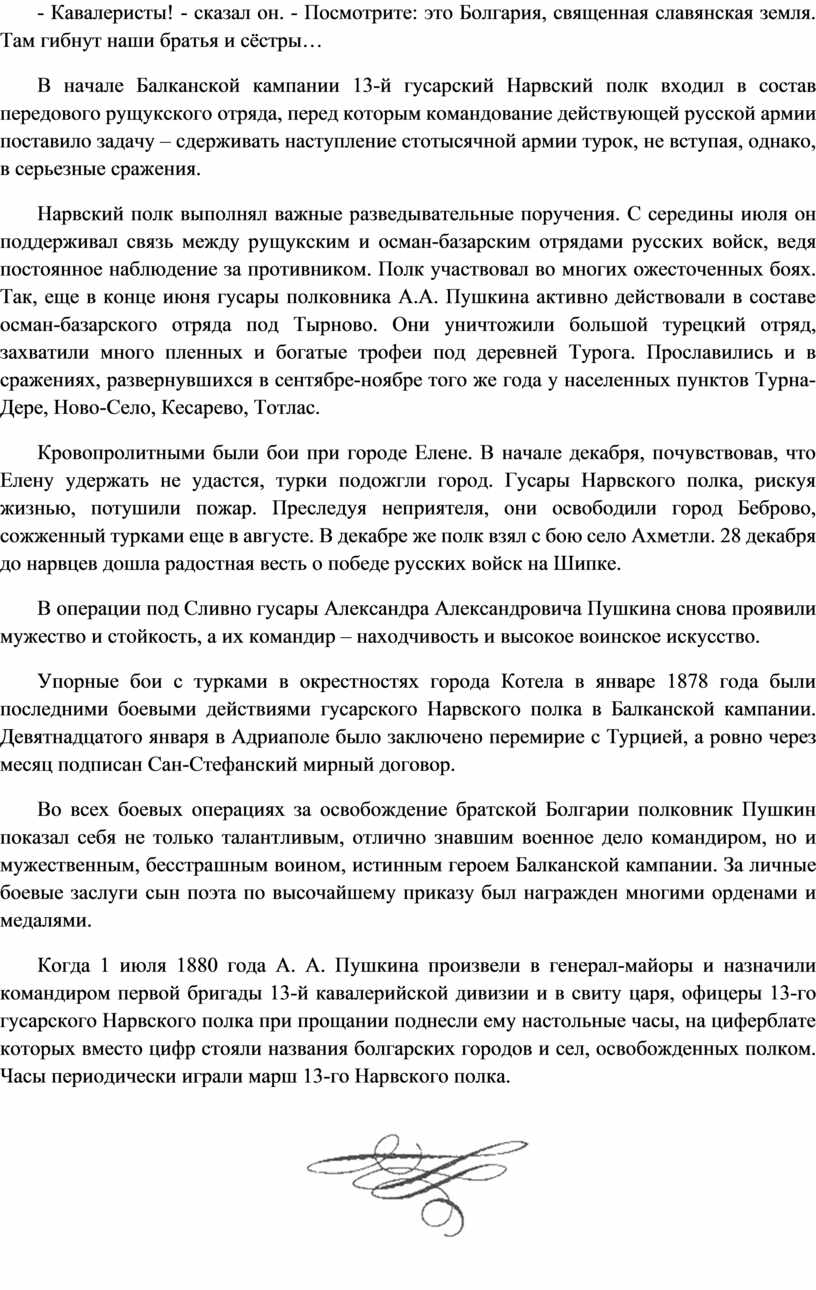 Когда 12 апреля 1877 года царским манифестом было объявлено, что Россия вступает в войну с Турцией, полк А.А. Пушкина получил приказ выступить в поход в составе 13-ой кавалерийской дивизии.