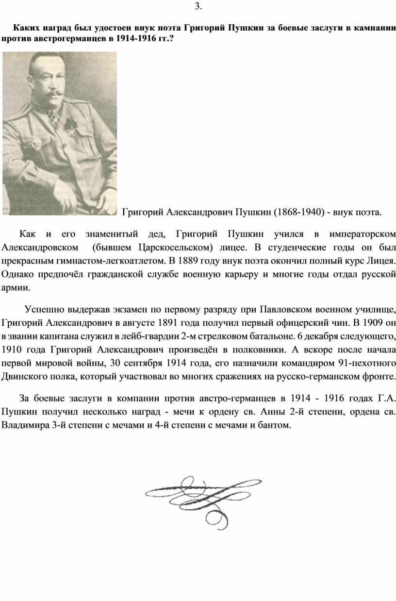Каких наград был удостоен внук поэта Григорий Пушкин за боевые заслуги в кампании против австрогерманцев в 1914-1916 гг.?