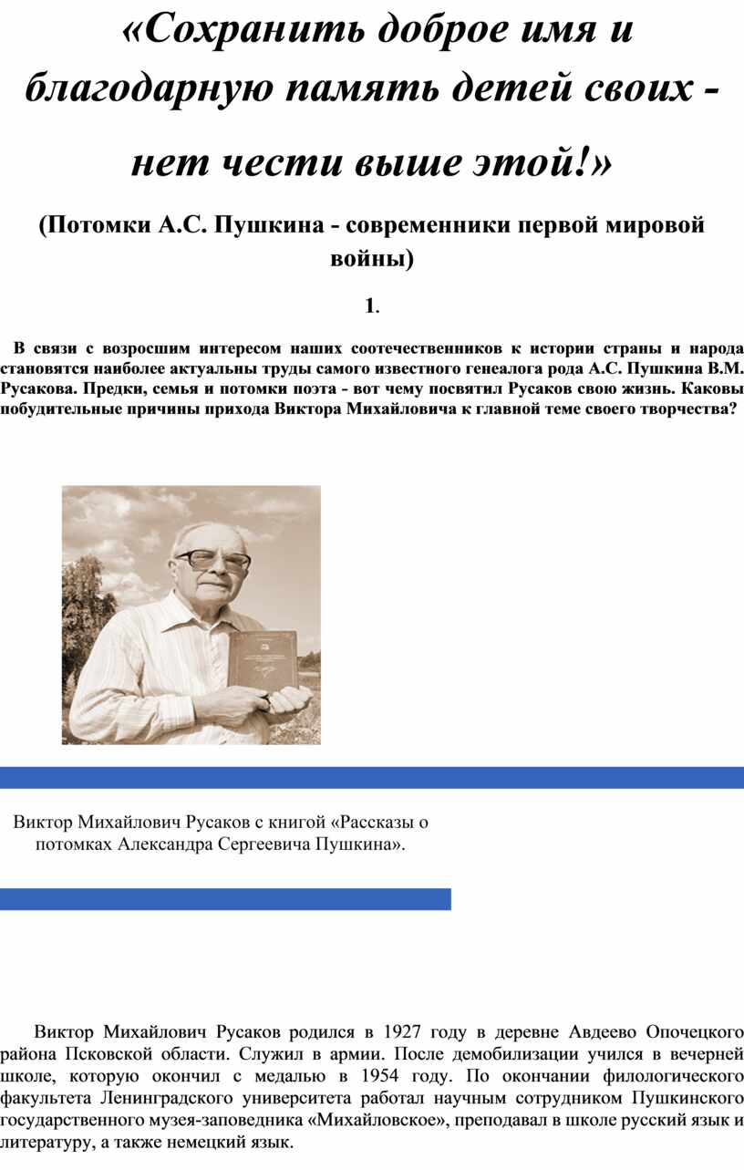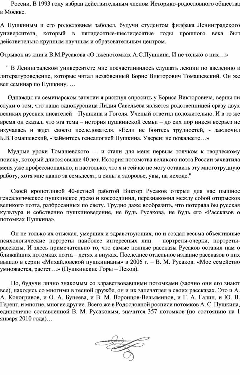 Но, будучи лично знакомым со здравствовавшими потомками (заочно они его знают все), находясь со многими в тесной дружбе, он и их запечатлел в своих рассказах. Это и А. А. Кологривов, и О. А. Бунеева, и В. М. Воронцов-Вельяминов, и Г. А. Галин, и Ю. В. Геренг, и многие, многие другие. Всего же в Родословной росписи потомков А. С. Пушкина, единолично составленной В. М. Русаковым, значится 357 потомков (по состоянию на 1 января 2010 года)…