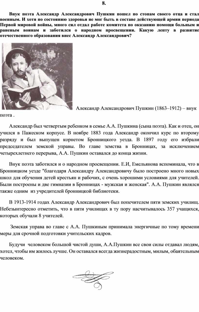 Внук поэта Александр Александрович Пушкин пошел по стопам своего отца и стал военным. И хотя по состоянию здоровья не мог быть в составе действующей армии периода Первой мировой войны, много сил отдал работе комитета по оказанию помощи больным и раненым воинам и заботился о народном просвещении. Какую лепту в развитие отечественного образования внес Александр Александрович?