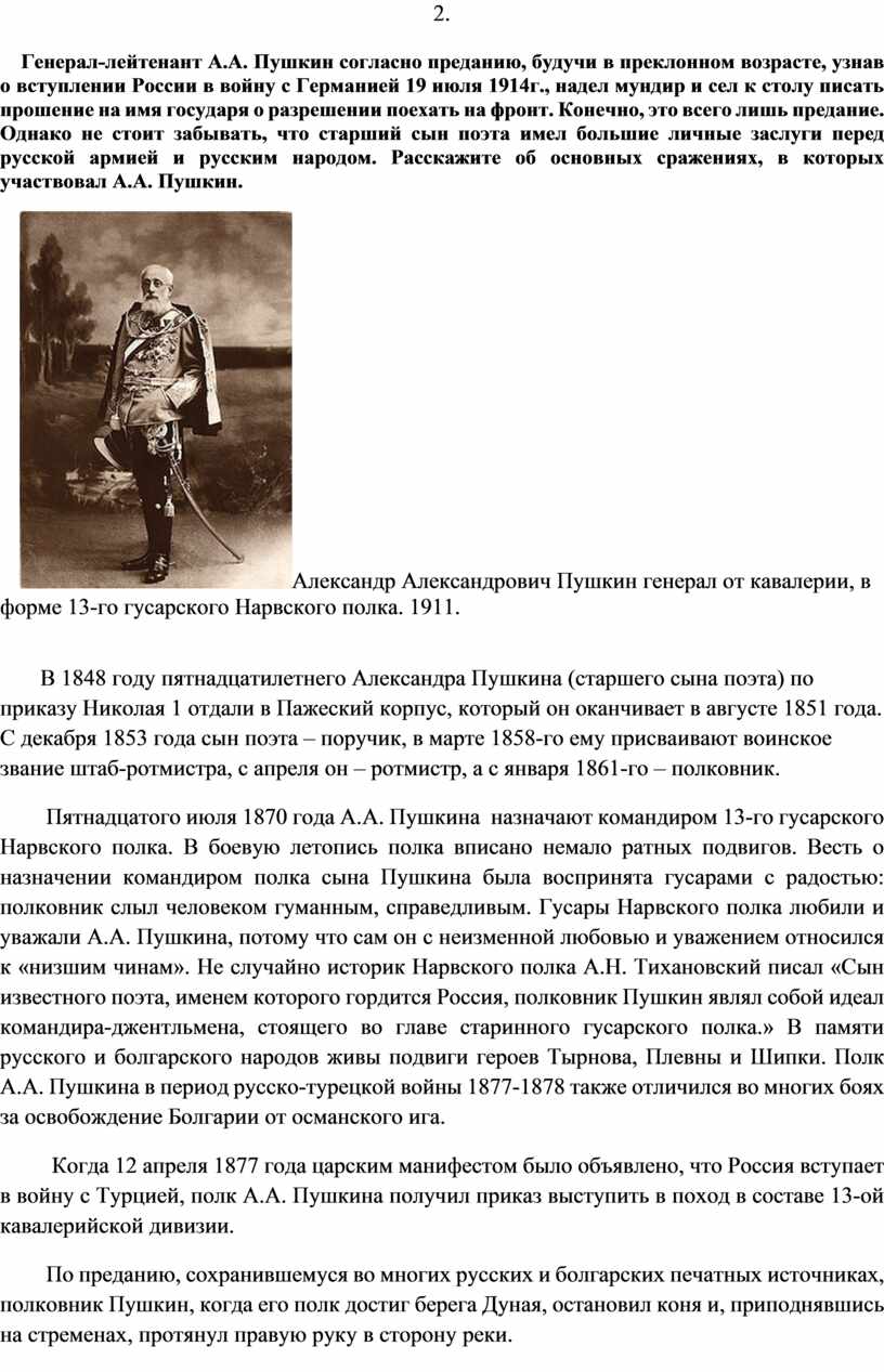 Генерал-лейтенант А.А. Пушкин согласно преданию, будучи в преклонном возрасте, узнав о вступлении России в войну с Германией 19 июля 1914г., надел мундир и сел к столу писать прошение на имя государя о разрешении поехать на фронт. Конечно, это всего лишь предание. Однако не стоит забывать, что старший сын поэта имел большие личные заслуги перед русской армией и русским народом. Расскажите об основных сражениях, в которых участвовал А.А. Пушкин.