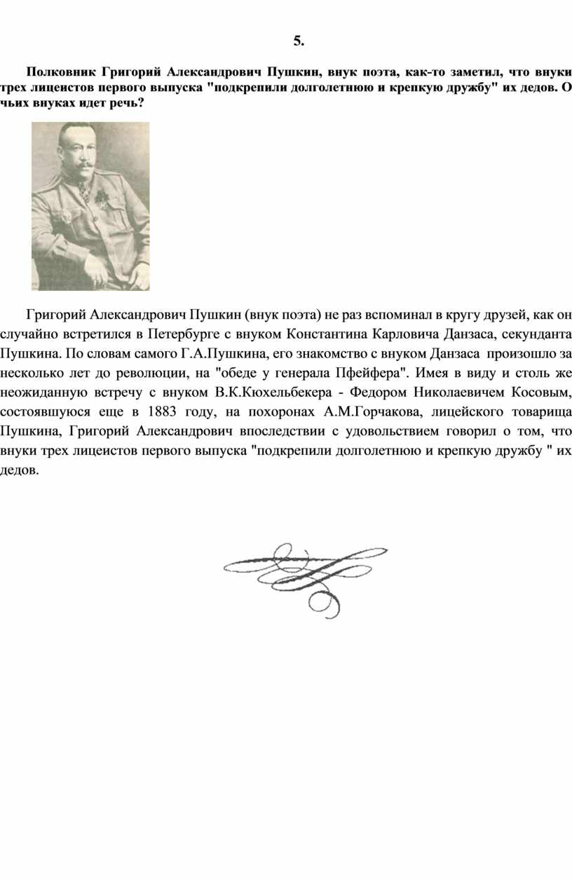 Полковник Григорий Александрович Пушкин, внук поэта, как-то заметил, что внуки трех лицеистов первого выпуска "подкрепили долголетнюю и крепкую дружбу" их дедов. О чьих внуках идет речь?