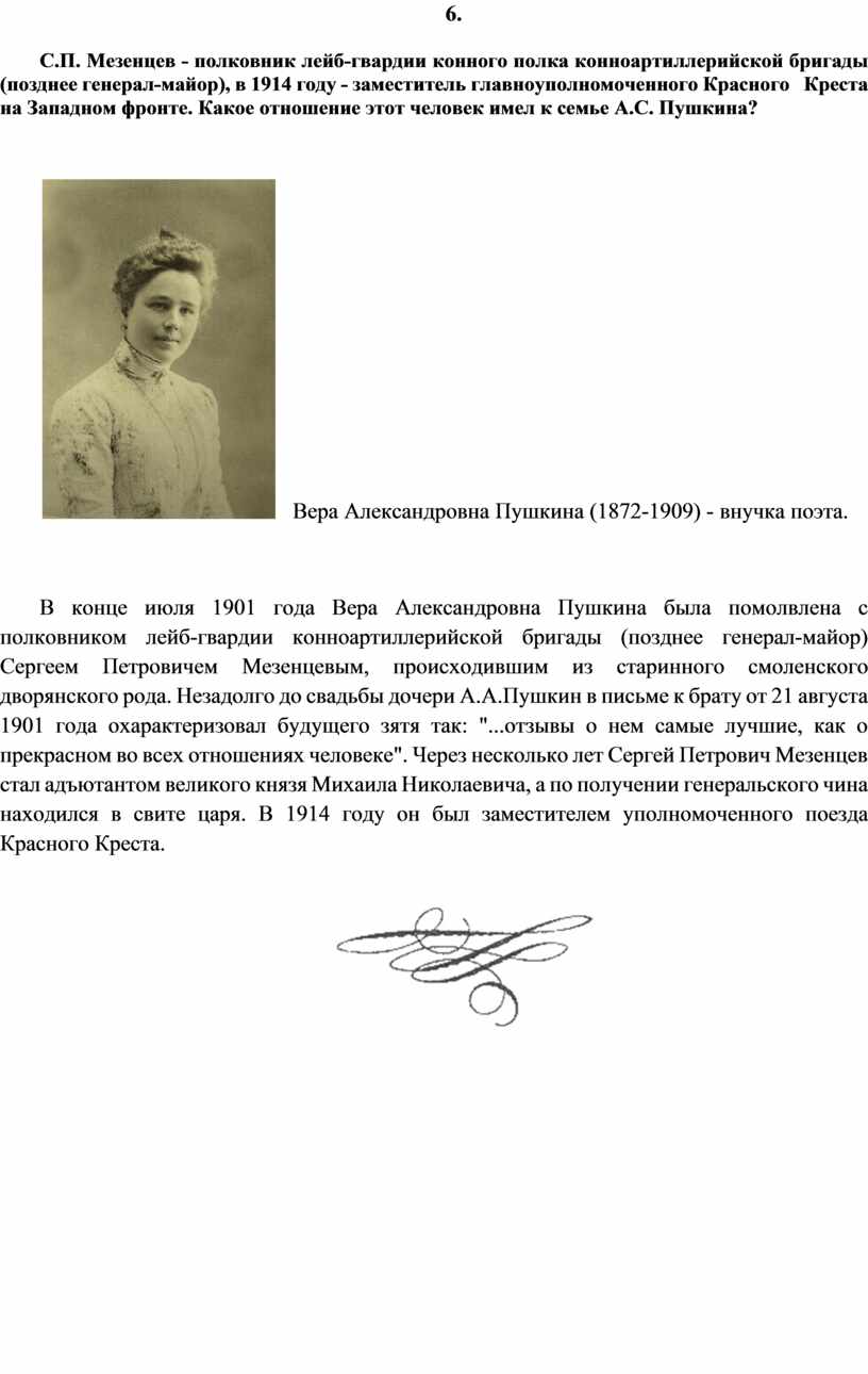 С.П. Мезенцев - полковник лейб-гвардии конного полка конноартиллерийской бригады (позднее генерал-майор), в 1914 году - заместитель главноуполномоченного Красного Креста на Западном фронте. Какое отношение этот человек имел к семье А.С. Пушкина?