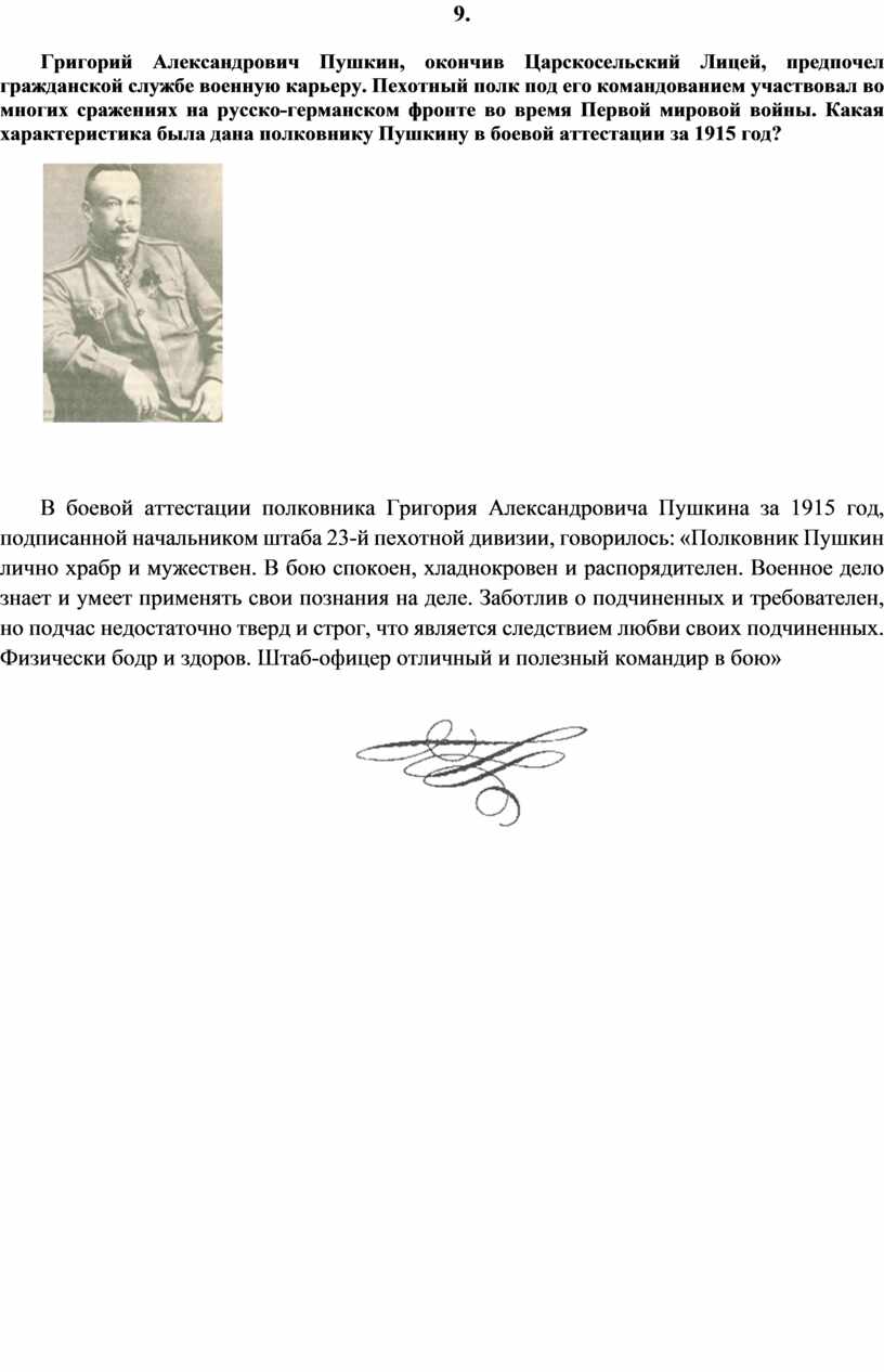 Григорий Александрович Пушкин, окончив Царскосельский Лицей, предпочел гражданской службе военную карьеру. Пехотный полк под его командованием участвовал во многих сражениях на русско-германском фронте во время Первой мировой войны. Какая характеристика была дана полковнику Пушкину в боевой аттестации за 1915 год?