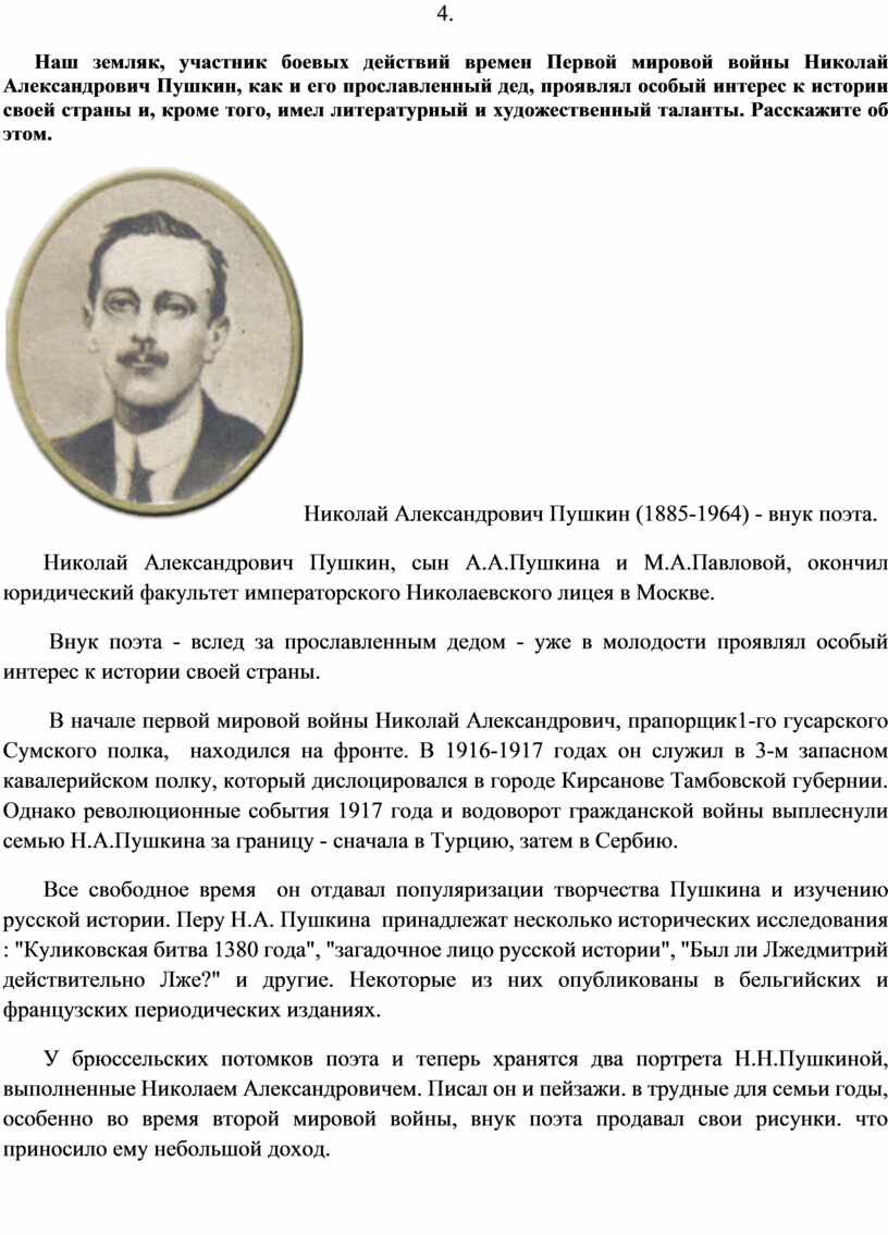 Наш земляк, участник боевых действий времен Первой мировой войны Николай Александрович Пушкин, как и его прославленный дед, проявлял особый интерес к истории своей страны и, кроме того, имел литературный и художественный таланты. Расскажите об этом.