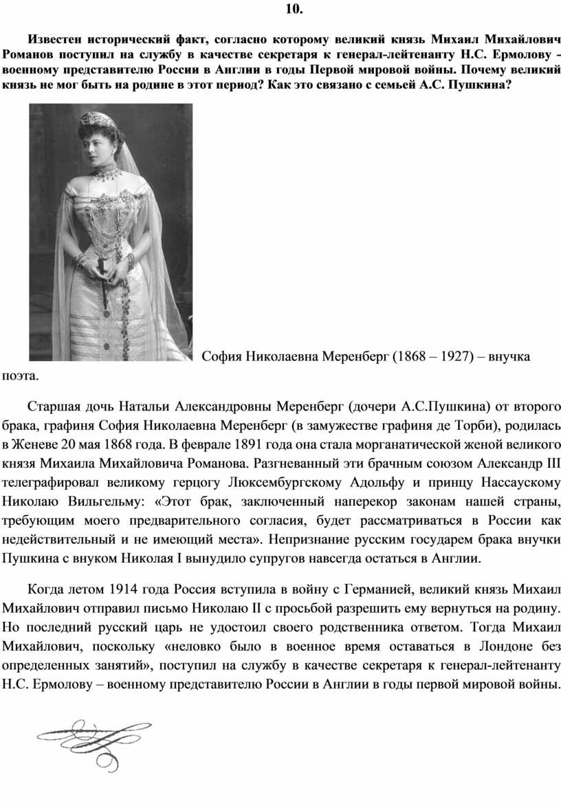 Известен исторический факт, согласно которому великий князь Михаил Михайлович Романов поступил на службу в качестве секретаря к генерал-лейтенанту Н.С. Ермолову - военному представителю России в Англии в годы Первой мировой войны. Почему великий князь не мог быть на родине в этот период? Как это связано с семьей А.С. Пушкина?