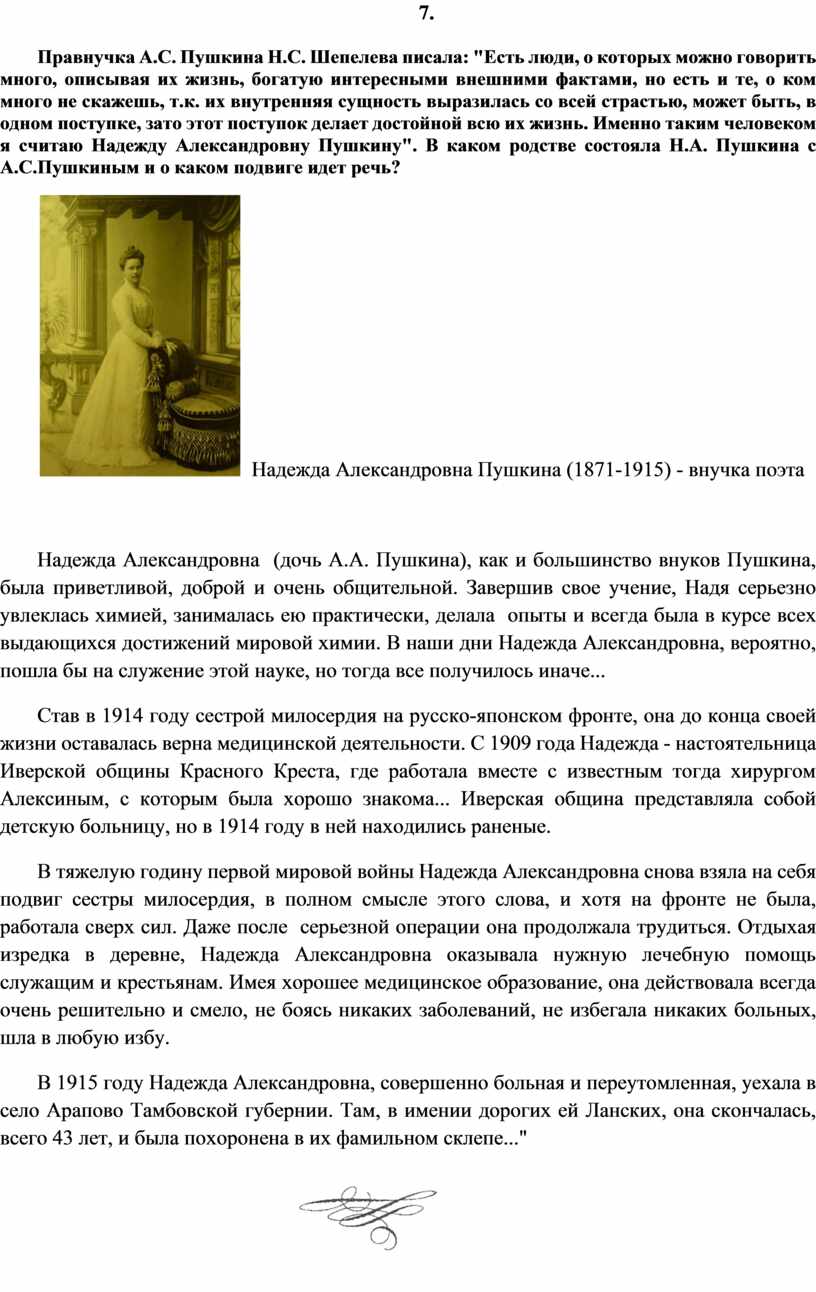 Правнучка А.С. Пушкина Н.С. Шепелева писала: "Есть люди, о которых можно говорить много, описывая их жизнь, богатую интересными внешними фактами, но есть и те, о ком много не скажешь, т.к. их внутренняя сущность выразилась со всей страстью, может быть, в одном поступке, зато этот поступок делает достойной всю их жизнь. Именно таким человеком я считаю Надежду Александровну Пушкину". В каком родстве состояла Н.А. Пушкина с А.С.Пушкиным и о каком подвиге идет речь?