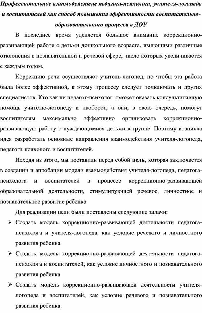 Исходя из этого, мы поставили перед собой цель, которая заключается в создании и апробации модели взаимодействия учителя-логопеда, педагога-психолога и воспитателей в процессе коррекционно-развивающей образовательной деятельности, стимулирующей речевое, личностное и познавательное развитие ребенка