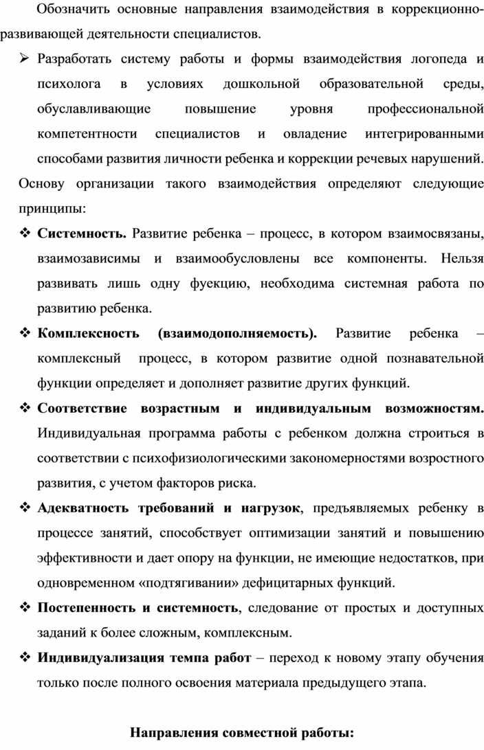Ø Разработать систему работы и формы взаимодействия логопеда и психолога в условиях дошкольной образовательной среды, обуславливающие повышение уровня профессиональной компетентности специалистов и овладение интегрированными способами развития личности ребенка и коррекции речевых нарушений.