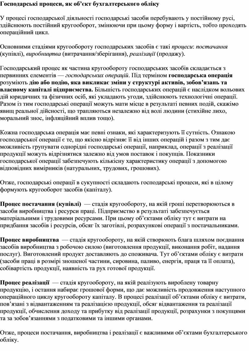 Отже, процеси постачання, виробництва і реалізації є важливими об’єктами бухгалтерського обліку.