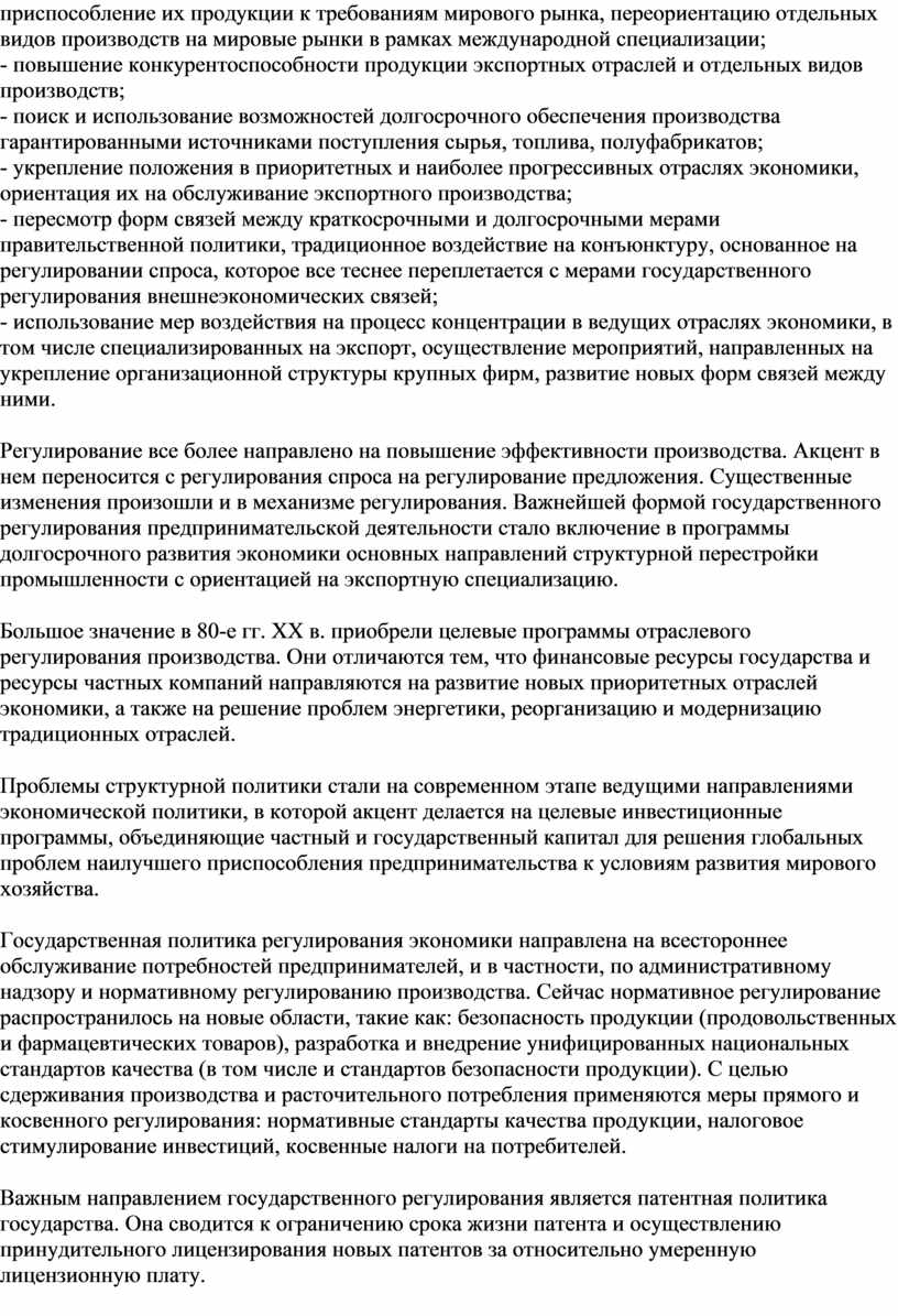 Регулирование все более направлено на повышение эффективности производства. Акцент в нем переносится с регулирования спроса на регулирование предложения. Существенные изменения произошли и в механизме регулирования. Важнейшей формой государственного регулирования предпринимательской деятельности стало включение в программы долгосрочного развития экономики основных направлений структурной перестройки промышленности с ориентацией на экспортную специализацию.